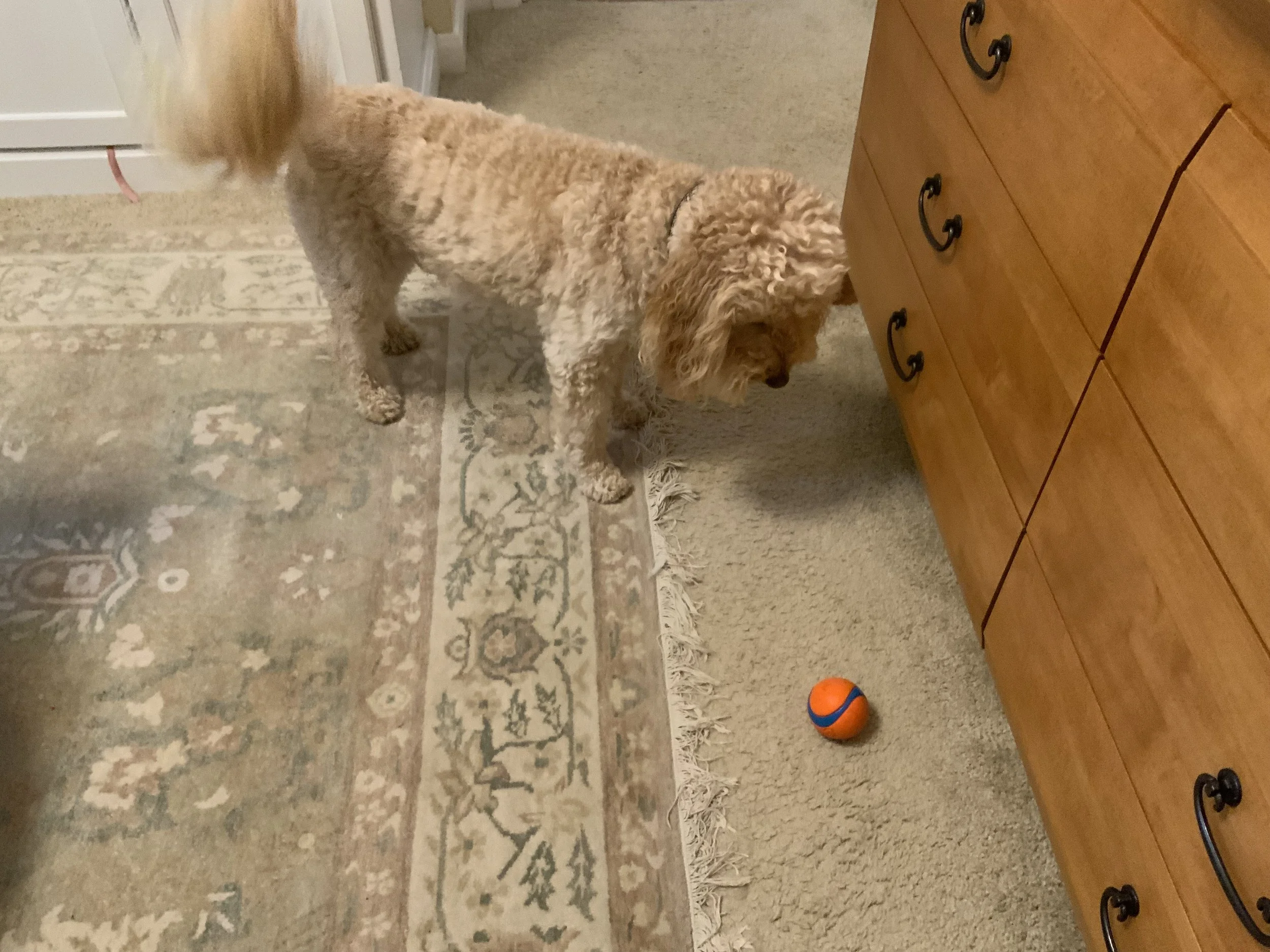 I’ve read the rules for teaching retrieve. I’ve tried the short distance throw, treats, praise, and patience. I’ve watched the videos. I’ve used reason. When he chooses to fetch the ball, he frequently takes it to his under-our-bed Doodle Cave and adds it to the stash already there: three pair of my socks, his fully-unstuffed chipmunk, the tug rope, and his Wabbit, recently relieved of its squeaker.