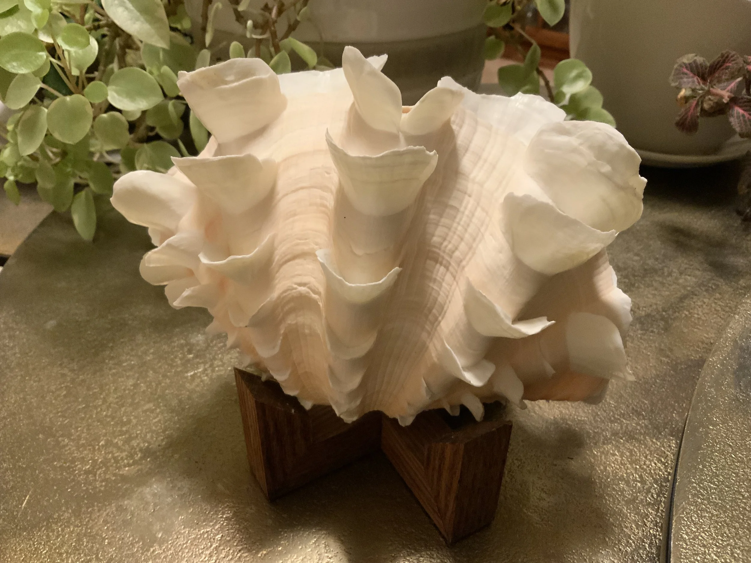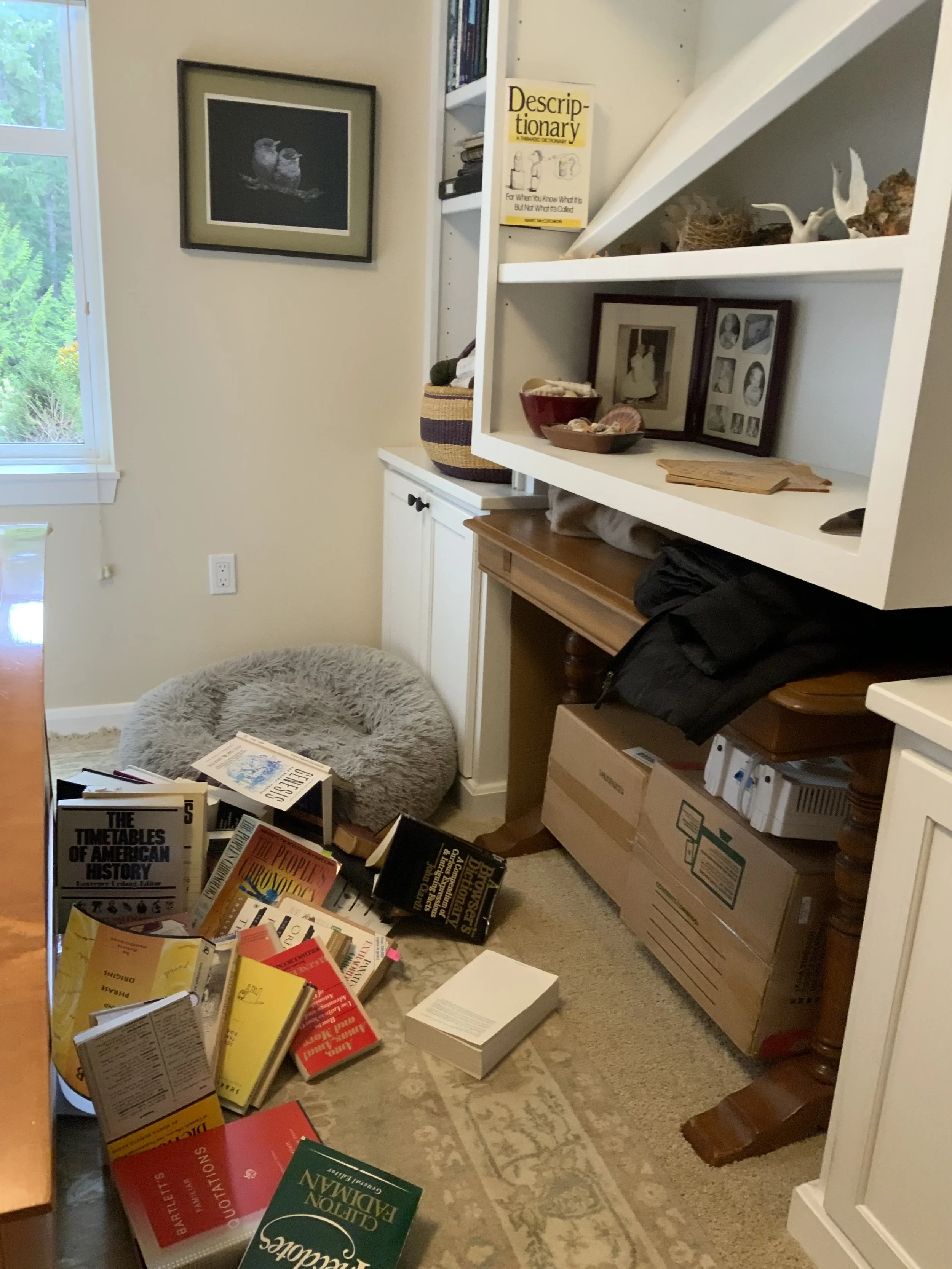 Yesterday’s crashing sound lifted my fingers from the computer keyboard, and me from my desk chair. Even the squirrel at my window birdfeeder was startled by the collapse of a large bookcase shelf throwing scores of weighty books to a bedroom floor. A giant Nautilus shell on the shelf below was smushed to smithereens as shelf supports gave way but the Giant Fluted clam behind it was spared. Whew!