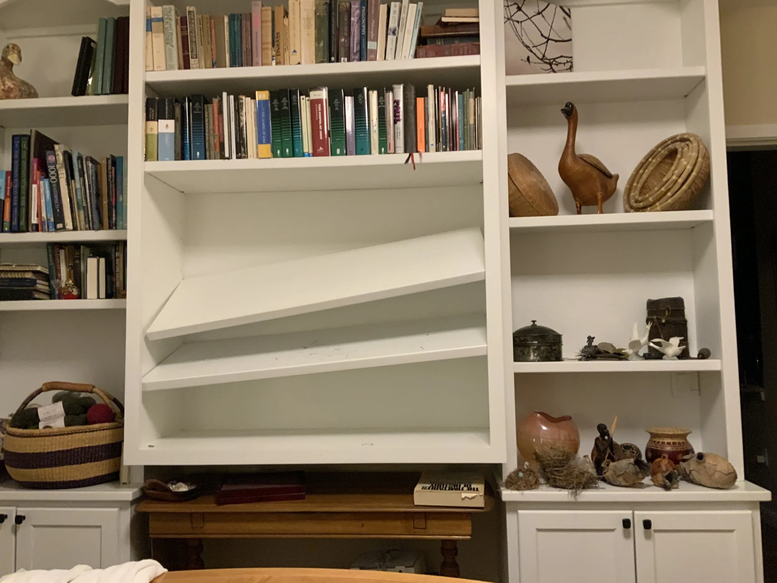 This time, the shelf that bolted forth the day before broke free of its burden yet again, and talked the shelf below into following suite. Books galore to the floor. This time, nothing is being put back. This time, once again the Giant Fluted clam survived with only a chip or two, sandwiched it was, between slices of shelving.